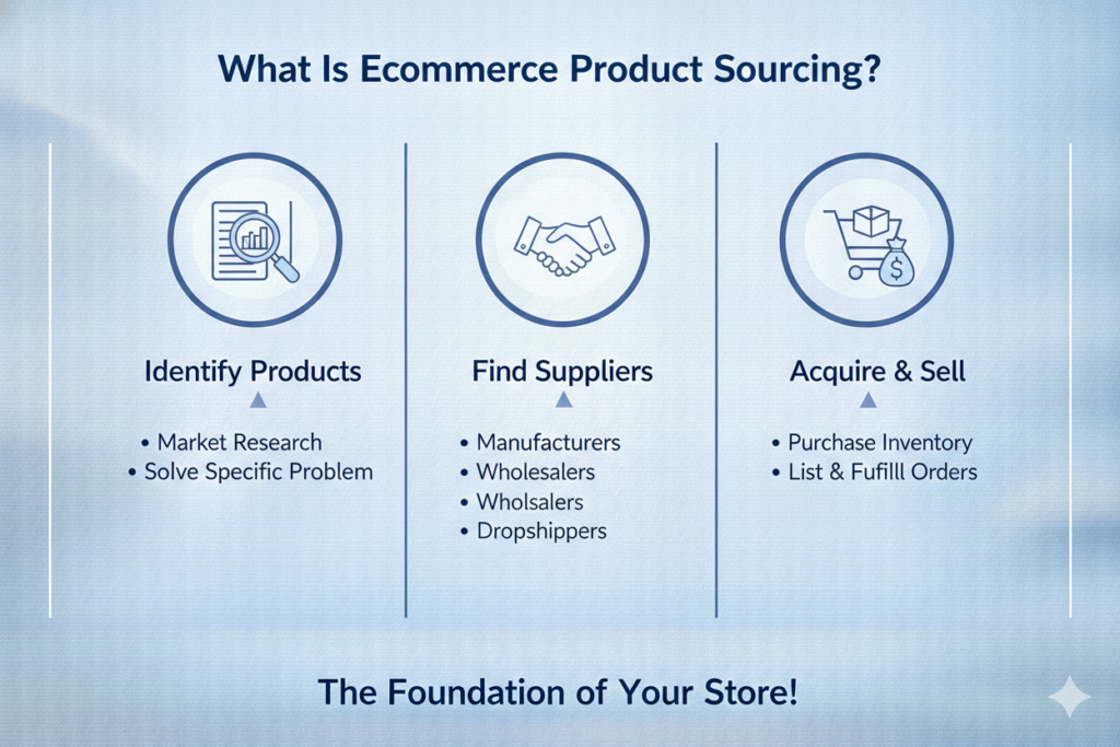 Ecommerce product sourcing is the systematic process of finding products from manufacturers, wholesalers, or suppliers and preparing them for sale through online platforms. This process includes supplier discovery, price negotiation, quality assurance, logistics planning, and long-term supplier management.