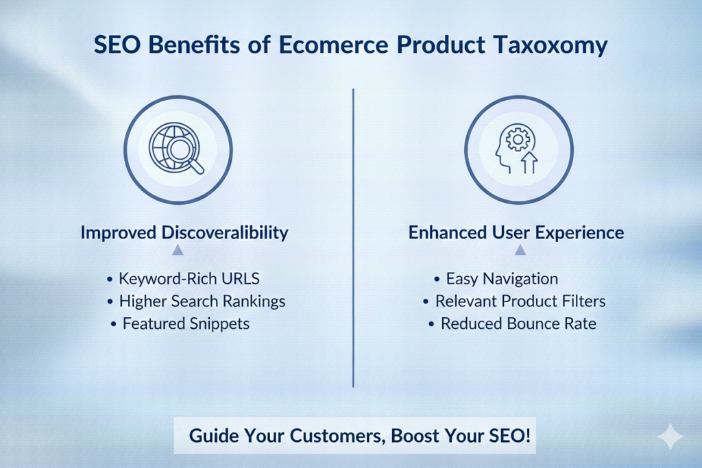 Search engines favor ecommerce websites with clear hierarchies and structured navigation. A strong taxonomy reduces duplicate content, improves indexing efficiency, and increases the visibility of category pages in search results.
