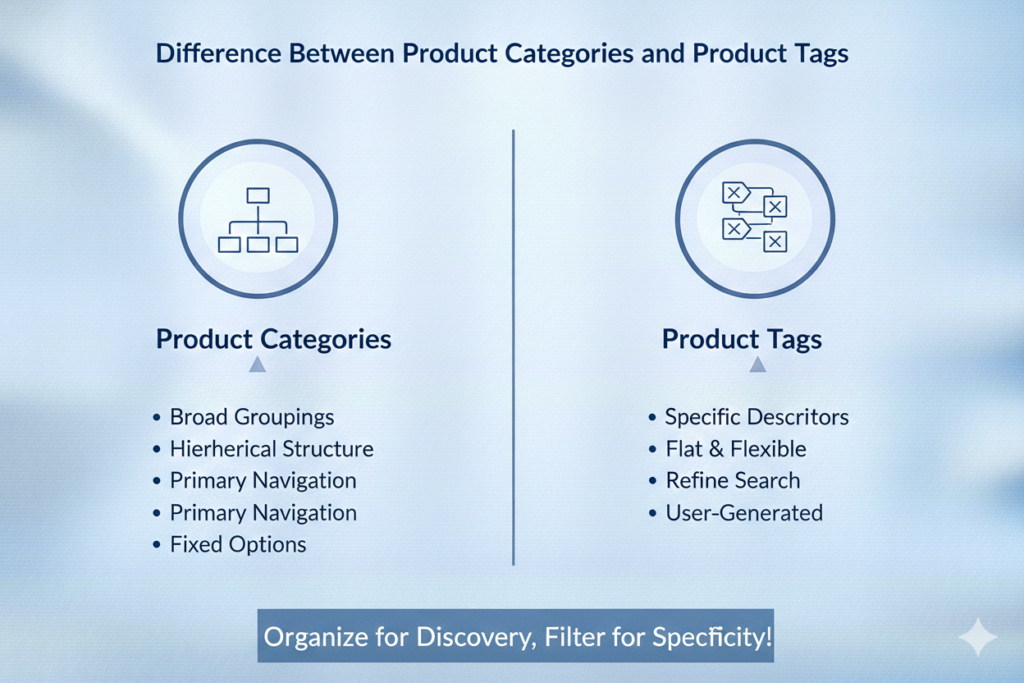 Product categories and product tags serve different but complementary purposes in ecommerce. Categories define the main structure of the store and are usually limited in number. Tags, on the other hand, are flexible labels that provide additional context and attributes.