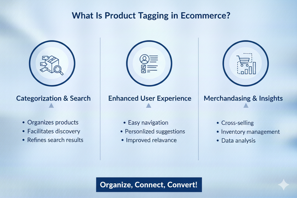In product tagging ecommerce, tags allow deeper product connections beyond basic categories. For example, two products in different categories can share the same tag such as âeco-friendlyâ or ânew arrival,â enabling cross-category discovery and smarter filtering.